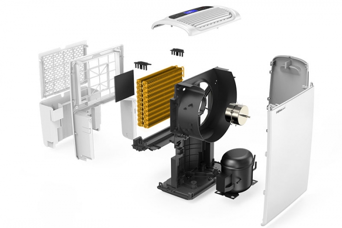 在正常開機工作的情況下→除濕機通過風機的運行→潮濕的空氣從進風口吸入→經過蒸發器冷熱交換→蒸發器將空氣中的水份子吸附在鋁翅片上→變成干燥的空氣→經過冷凝器散熱→從出風口吹出。